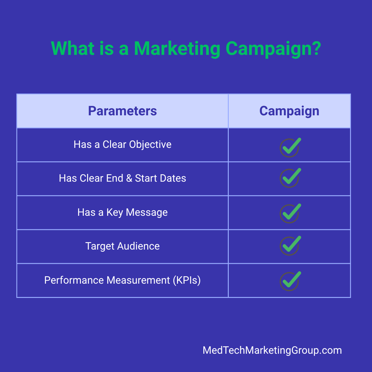 A marketing campaign is a set of marketing activities designed to achieve a business objective over a specified time frame. The most common type of campaign in medical device is an awareness campaign for a product launch which has a clear start (typically, FDA-approval marks the start of promotion) and an end (i.e., when paid media coverage stops).