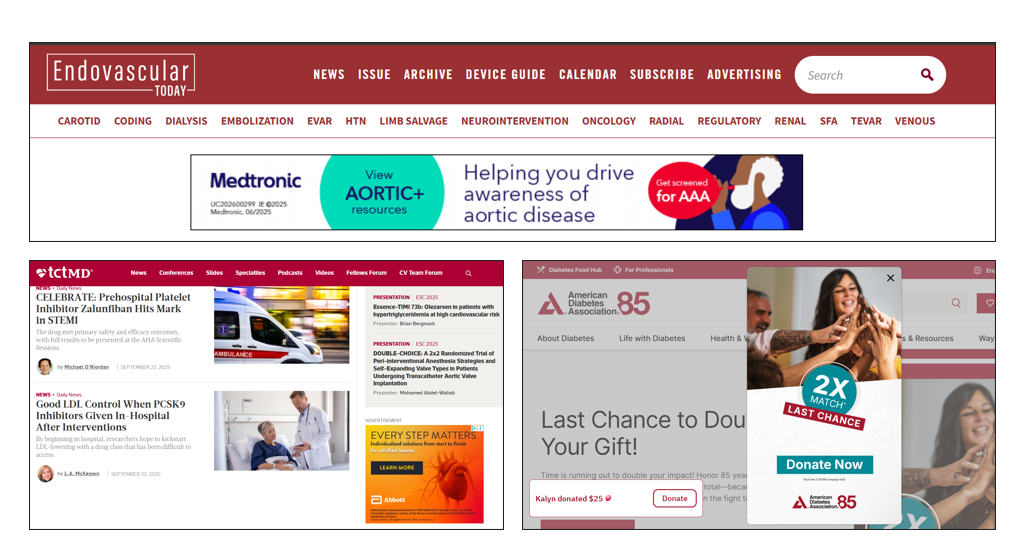 Usually, the purpose of an ad is to drive awareness, engagement or conversions. In MedTech, banner ads are most commonly associated—not limited to-- with driving awareness of product launch, disease state or new clinical data. Banner ads can be used to drive engagement (thanks to the various interactive formats that are now available) or drive conversions (usually for a specific event, but rarely used). These do require a more creative approach to the ad and using interactive formats. For the purpose of this article, we will focus on using banners ads to drive awareness.
