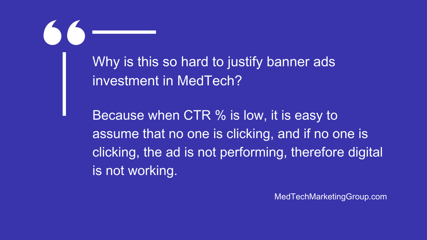 Why is this so hard to justify banner ads investment in MedTech? Because when CTR % is low, it is easy to assume that no one is clicking on the ad, and if no one is clicking, the ad is not performing, therefore digital is not working.